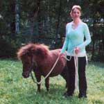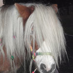 is our pinto Shetland Pony with brown and white patches. She is only about 10 hands tall, and is very gentle with little kids. She’s a bit like a Barbie pony with her long mane and forelock. She has fun when she’s being brushed and ribbons are being put in her hair!