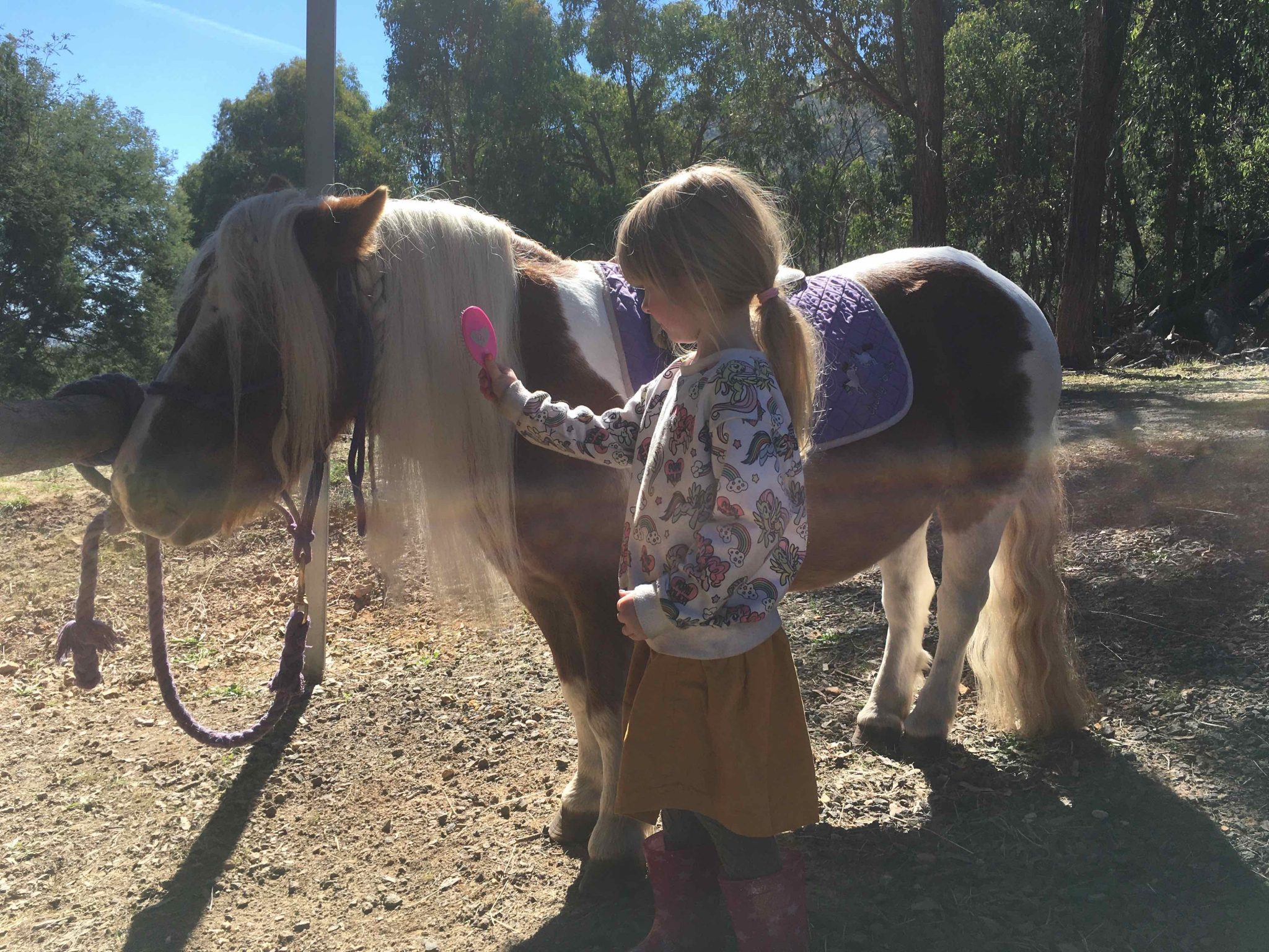 is our pinto Shetland Pony with brown and white patches. She is only about 10 hands tall, and is very gentle with little kids. She’s a bit like a Barbie pony with her long mane and forelock. She has fun when she’s being brushed and ribbons are being put in her hair!